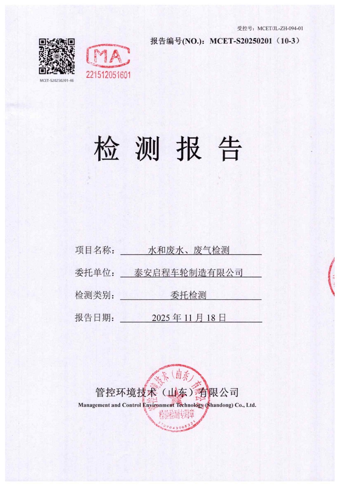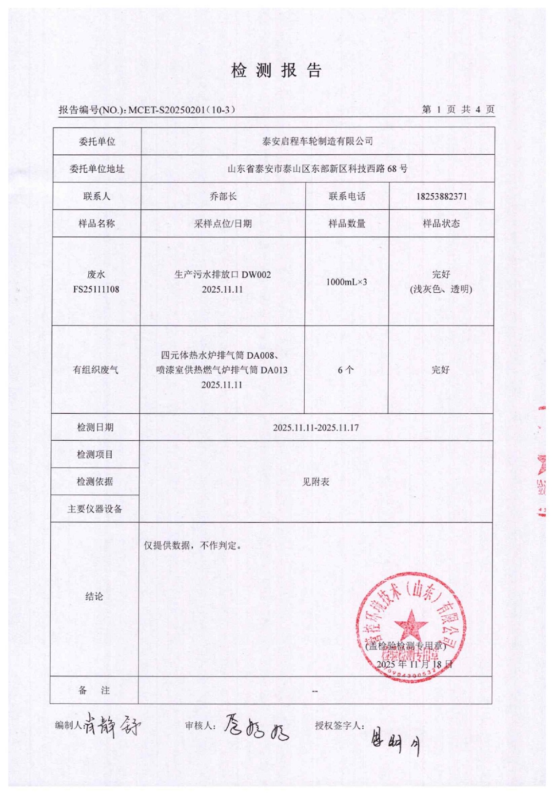 泰安啟程車輪制造有限公司2025年11月份環(huán)境污染物排放檢測報告