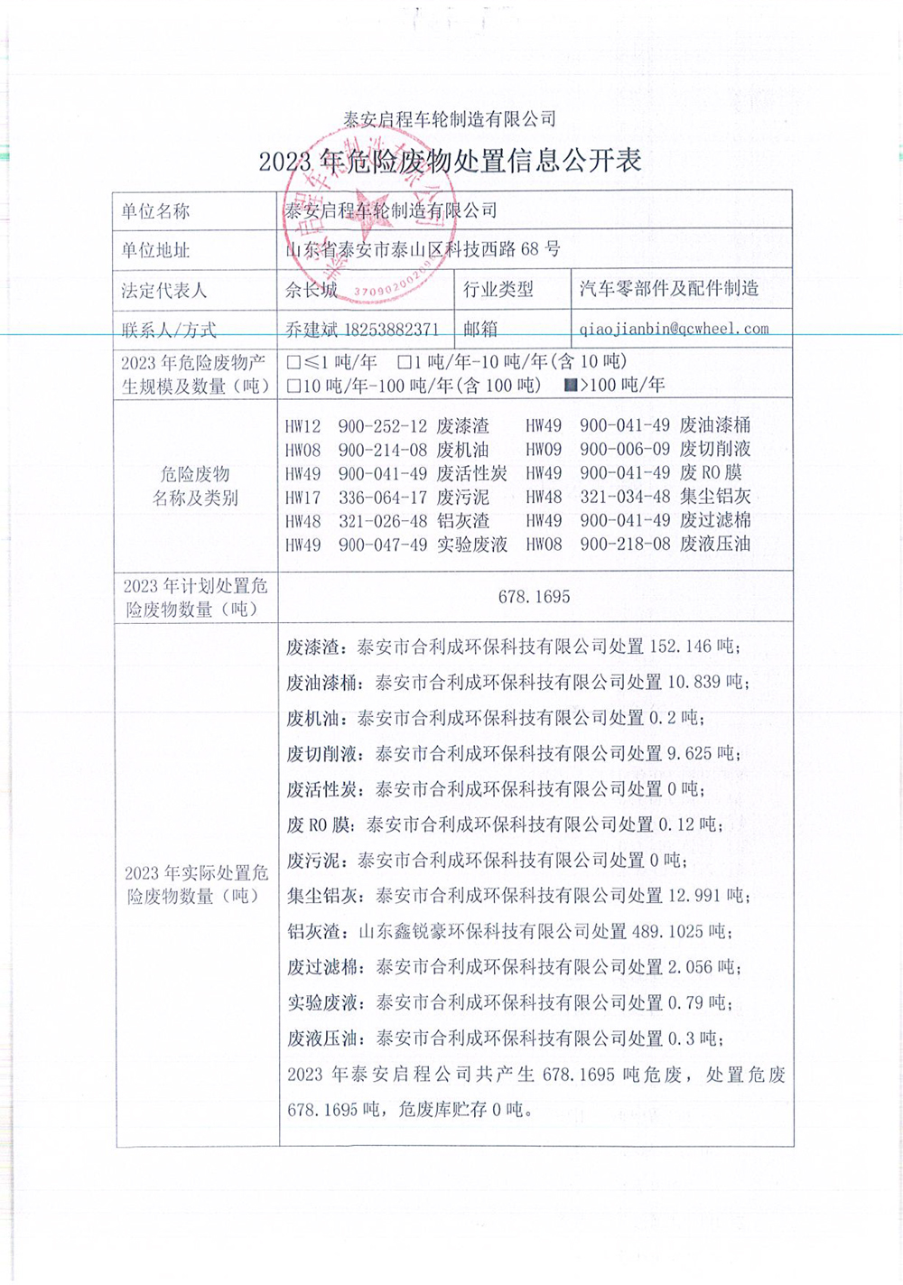 泰安啟程車(chē)輪制造有限公司危險(xiǎn)廢物處置信息公開(kāi)
