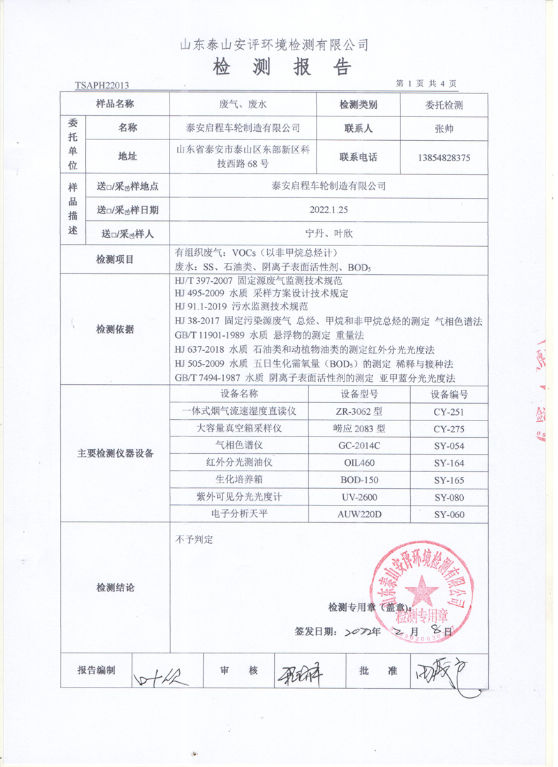 泰安啟程車輪制造有限公司2022年1月份環(huán)境污染物排放檢測(cè)報(bào)告