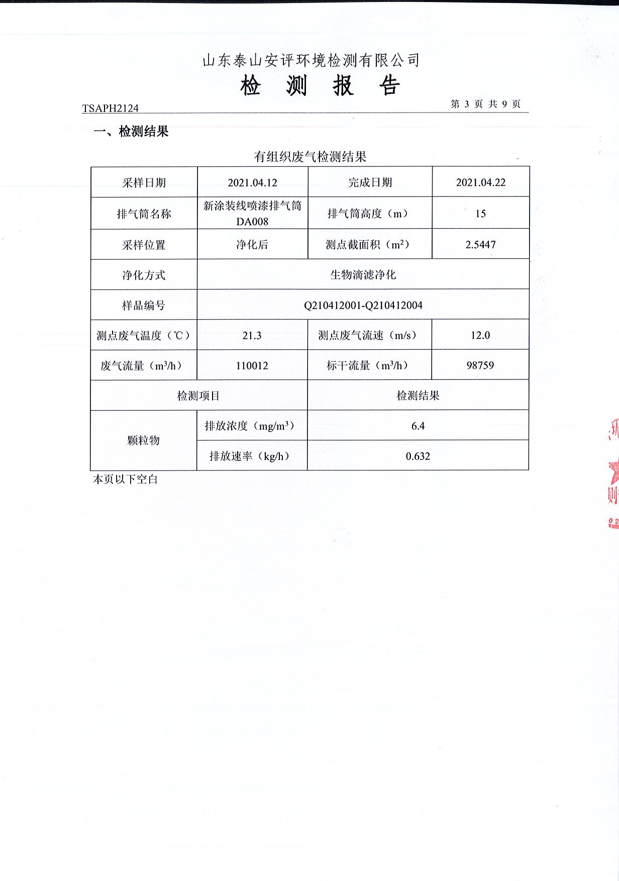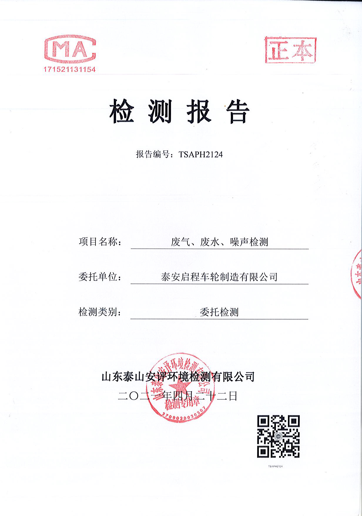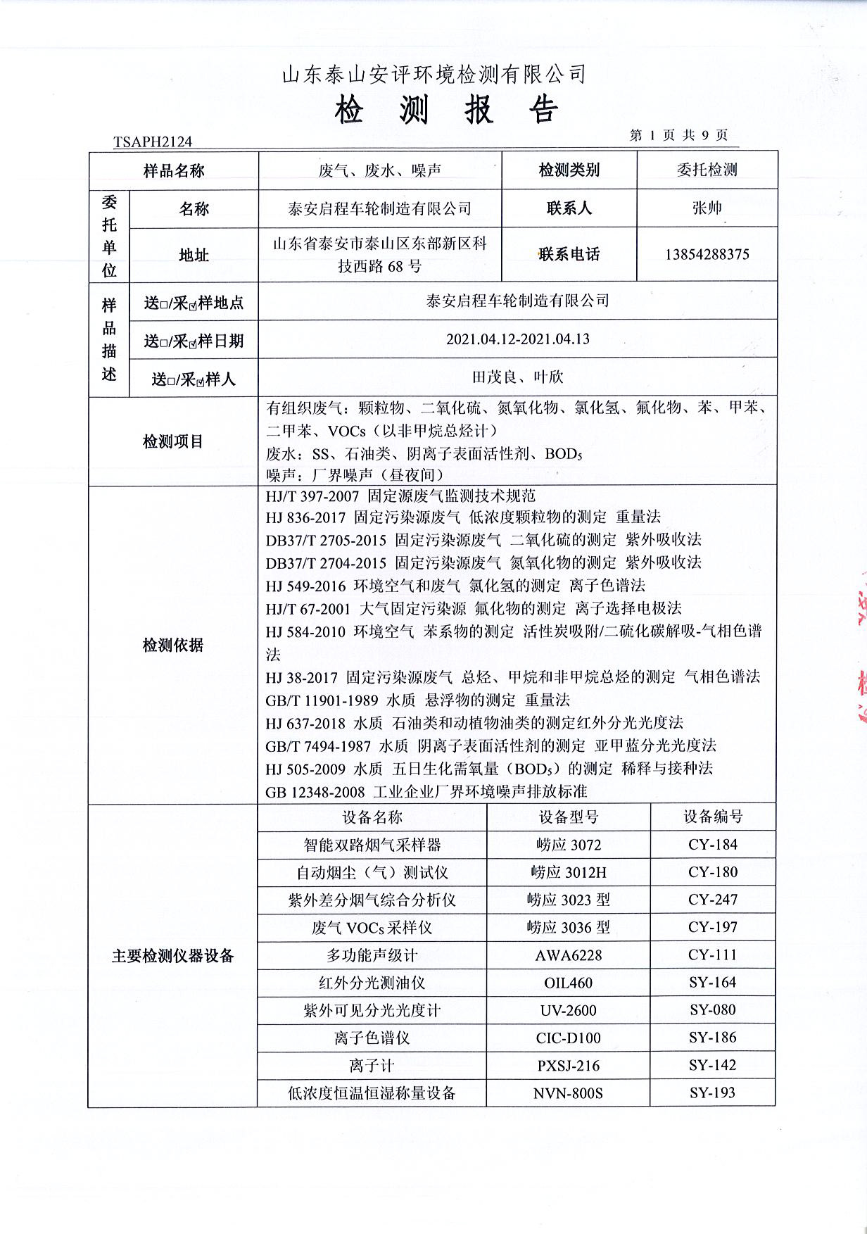 泰安啟程車輪制造有限公司2021年4月份環(huán)境污染物排放檢測(cè)報(bào)告