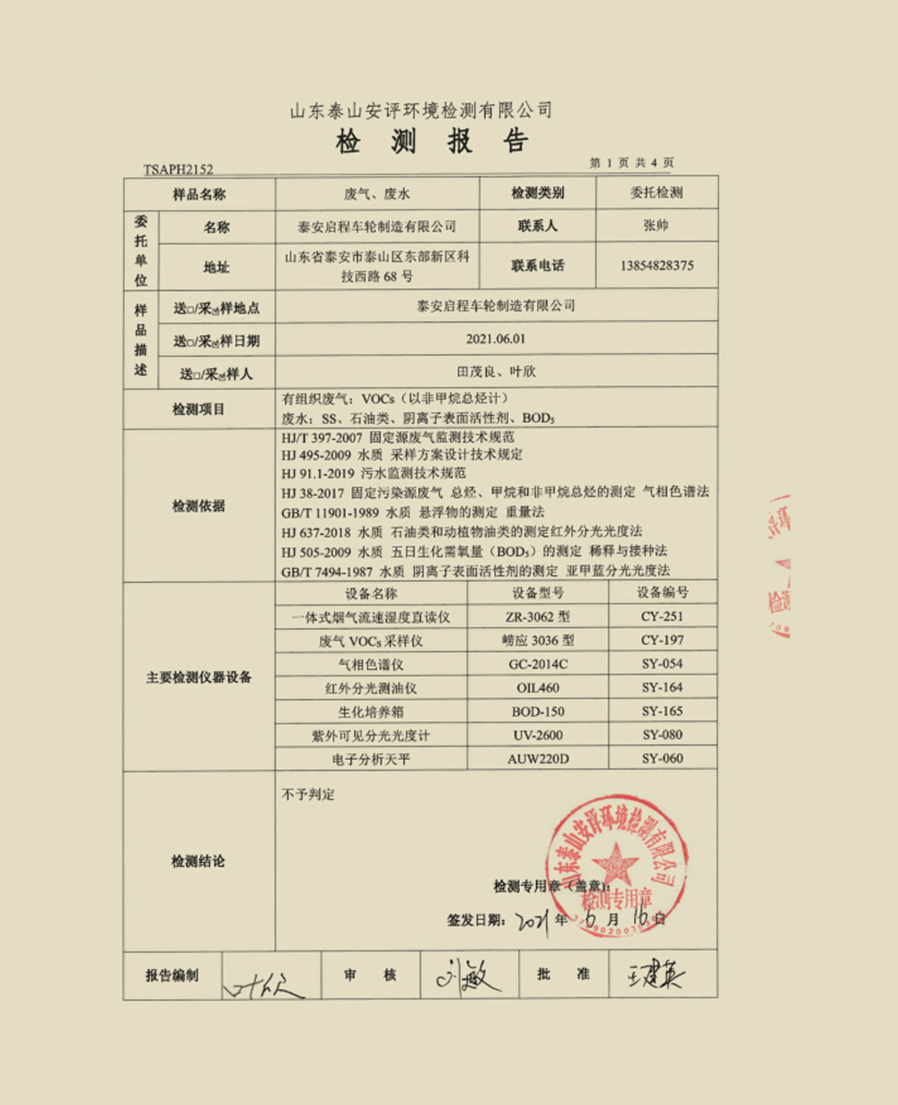 泰安啟程車輪制造有限公司2021年6月份環(huán)境污染物排放檢測報(bào)告